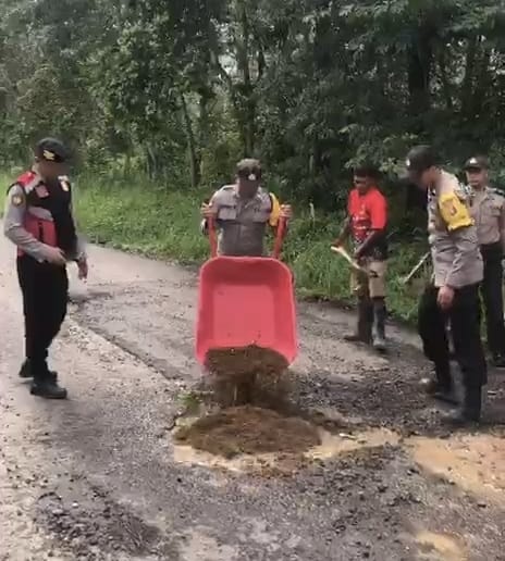 Kapolsek BTS Ulu Polres Musi Rawas Respon Cepat Timbun Jalan Berlubang Cegah Kecelakaan