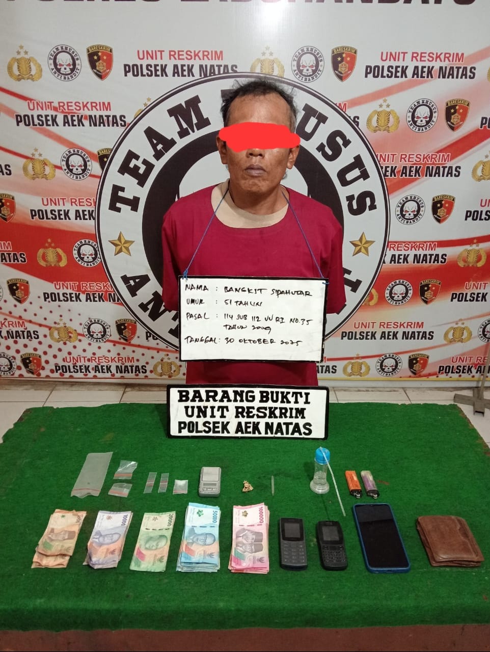 Menindaklanjuti laporan tersebut, Kapolsek Aek Natas AKP Sofyan, S.H., M.H. memerintahkan Kanit Reskrim Iptu Dr. Iskandar Muda Sipayung, S.H., M.H., M.M. beserta tim opsnal untuk melakukan penyelidikan. Setiba di lokasi, petugas melihat seorang pria dengan gerak-gerik mencurigakan di depan rumahnya. Saat dilakukan penggerebekan, tersangka tidak dapat mengelak ketika petugas menemukan sejumlah barang bukti narkotika.