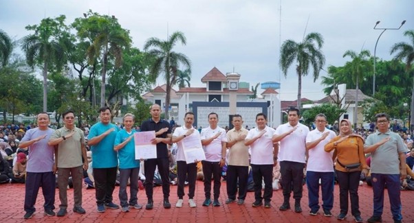Bupati Karawang, H. Aep Syaepuloh SE memberikan arahan dalam agenda rutin senam pagi sekaligus dipadukan dengan penandataganan SLA dan Pemberian Bantuan dari BPJS Ketenagakerjaan pada 23 Januari 2026 di Plaza Pemda.