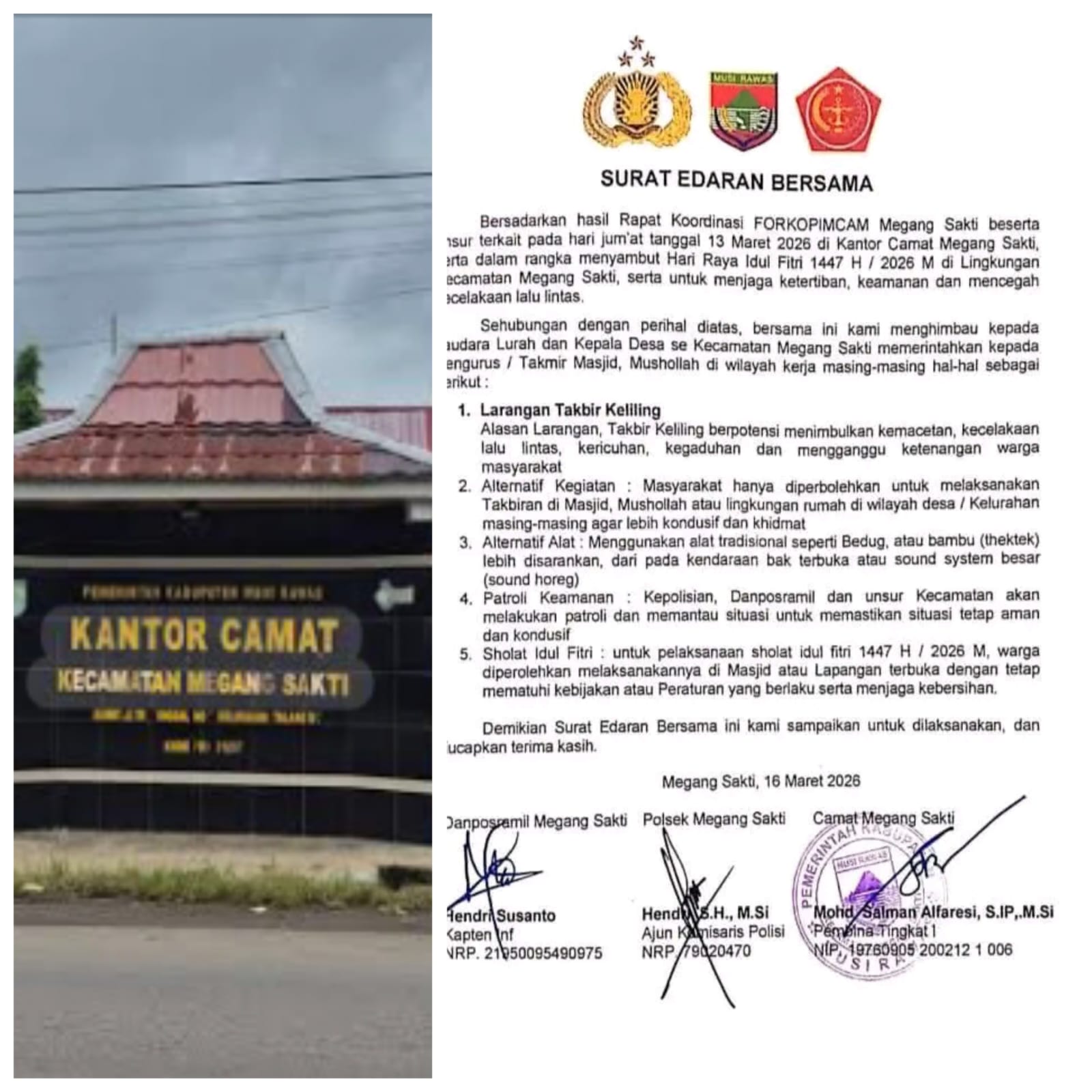 Surat edaran bersama tersebut diterbitkan pada hari Senin,16 Maret 2026 setelah adanya rapat Koordinasi pada hari Jumat tanggal 13 Maret 2026 di Kantor Camat Megang Sakti dalam rangka menyambut Hari Raya Idul Fitri 1447 H / 2026.