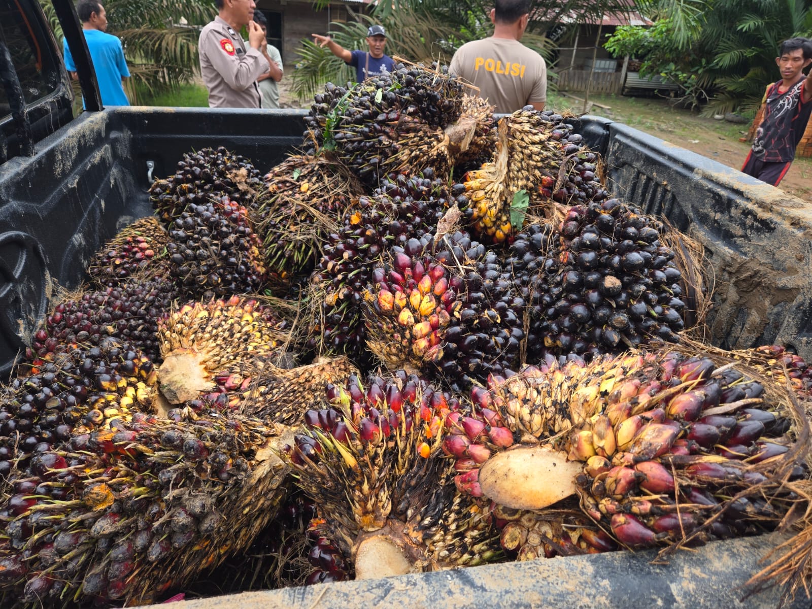 “Petugas mengamankan barang bukti berupa 55 janjang buah kelapa sawit dengan berat sekitar 750 kilogram atau senilai kurang lebih Rp2.362.500, dua buah dodos, satu keranjang plastik warna biru, serta satu unit sepeda motor jenis Supra Pit yang digunakan pelaku,” jelasnya.