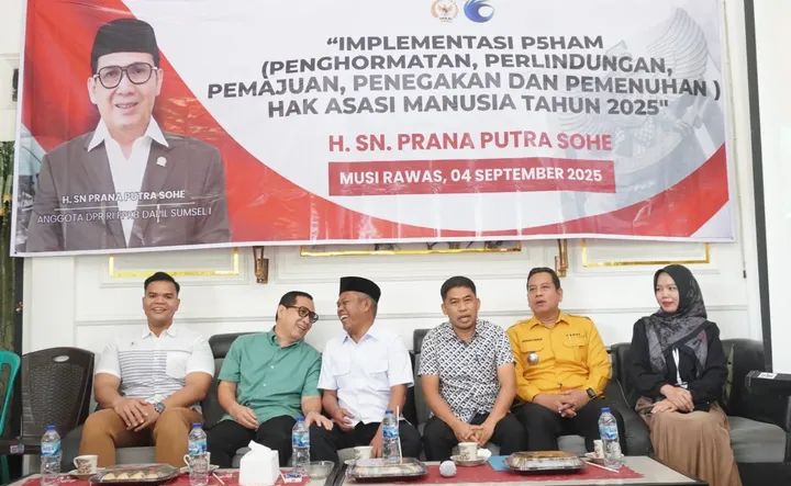 Musi Rawas gaungdemokrasi.com- H. Suprayitno Wakil Bupati Musi Rawas menghadiri Implementasi Penghormatan, Perlindungan, Pemajuan, Penegakan dan Pemenuhan Hak Asasi Manusia (P5HAM) Tahun 2025 yang di hadiri oleh anggota DPR RI Komisi 13 H. SN Prana Putra Sohe, di The Ligat Cafe Lubuk Rumbai Kecamatan Tuah Negeri, pada Kamis ,4 September 2025.